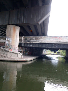 For the boater, though, the highpoint is reaching our own canal Spaghetti Junction where the B&F meets the Tame Valley and Grand Union canals in a four way junction (with the River Tame tucked nearby as well) -- all of takes place right underneath the better known motorway Spaghetti Junction whose vast concrete columns are all around. The multiplicity of levels, ages and styles of construction is just bewildering (all of it decorated with the usual scrote markings of course.)